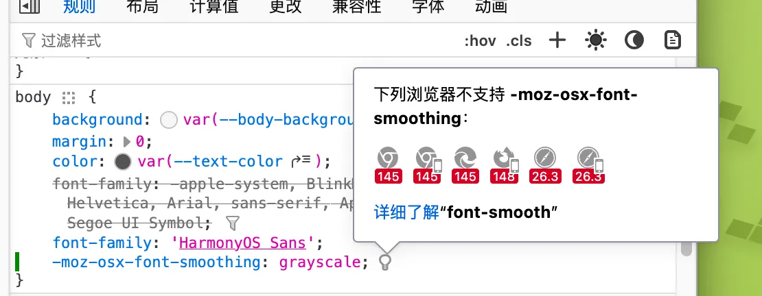 font-smooth确实不是标准 CSS,但 Chrome 和 FireFox 在 macOS 上有自己的实现。