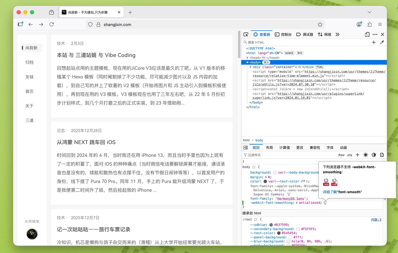 正刷着 B 站,然后又看看我的站,就感觉字体渲染,怪怪的。我这边,就显得傻大黑粗,看起来该用 normal 的地方用了 bold,该用 bold 的地方用了 bolder 的样子,而 B 站那头,字体大小,文本粗细,井然有序。